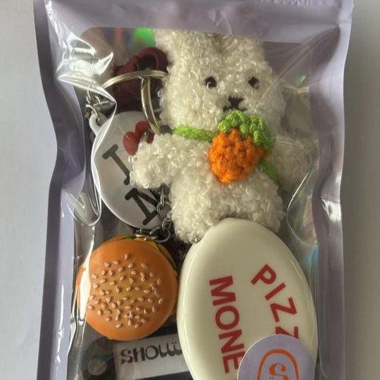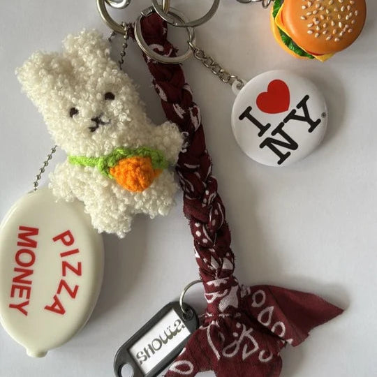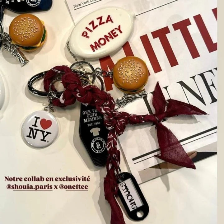 Un maxi Gris-Gris-de-sac, né de la collaboration avec la marque Shouïa, sur le thème de New York. Tresse One Tee en bandana bordeaux, peluche, breloque mini-hamburger, badge « I ❤️ NY »… Accroché à votre sac, ou garder vos clés à portée de main.