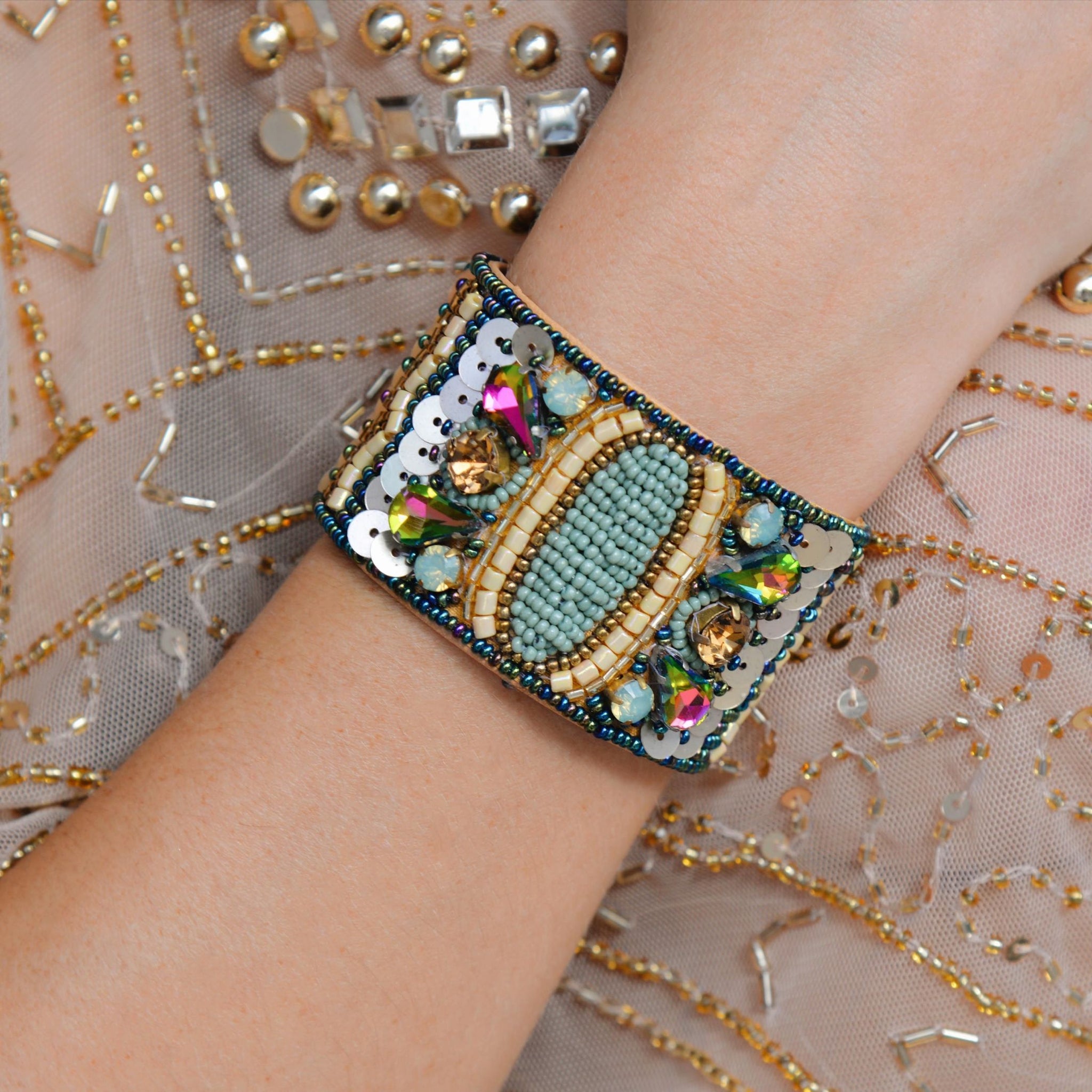 Recouverte d’un tissage de perles sur toute sa surface en simili cuir, ANETHA est une manchette large et rigide, d’une beauté saisissante. Des séquences de perles, des sequins en forme de disques solaires, et des cabochons facettés aux reflets multicolores déclinent des nuances de vert kaki, vert d’eau, et bleu pétrole, le tout rehaussé d'une lueur dorée et mordorée d'une luminosité exceptionnelle.