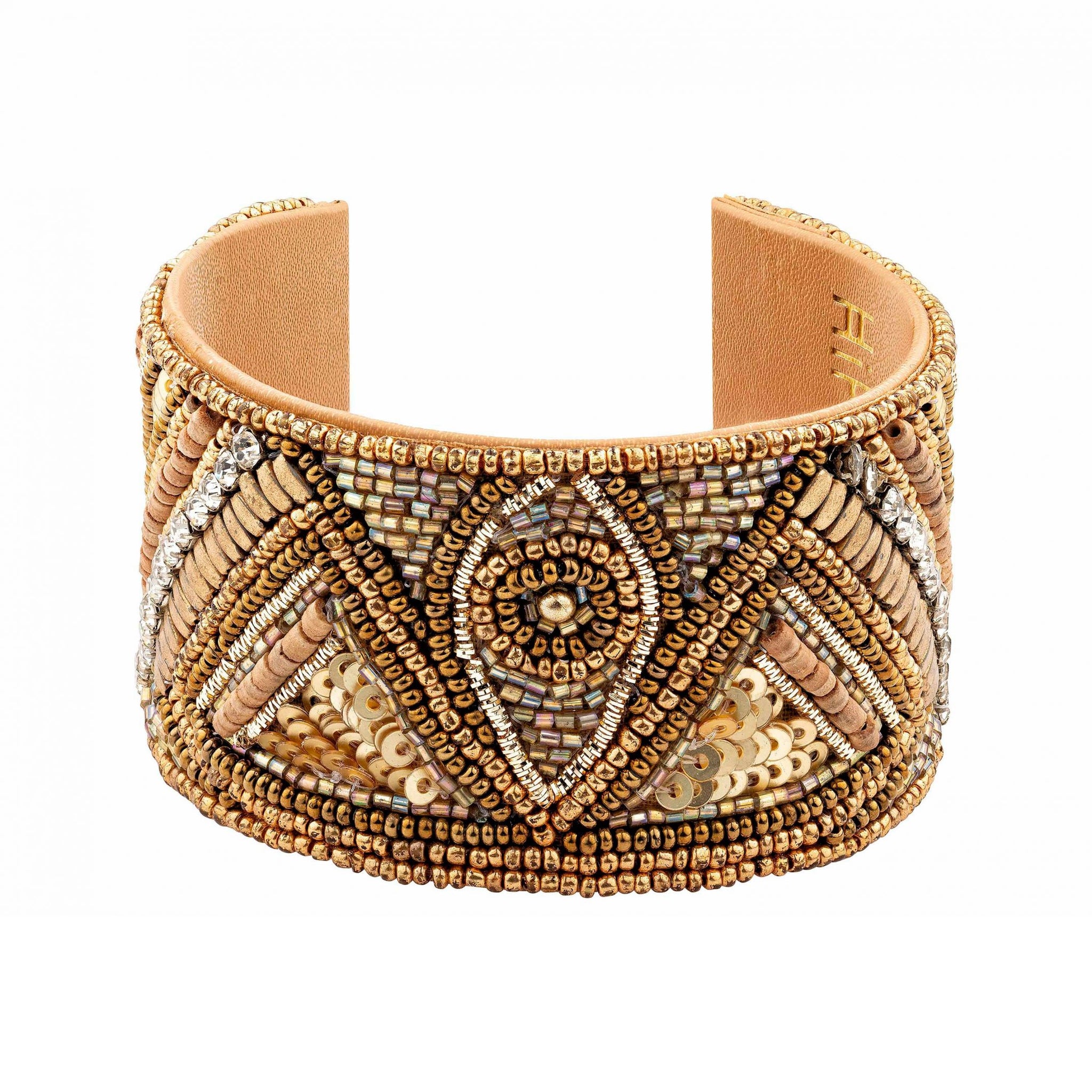 Le bracelet RIVOLTA est une manchette rigide, ouverte à l’arrière pour un confort optimal, qui reflète des tonalités dorées et mordorées. Des lignes de petites perles rondes et plates, rehaussées de rangées de strass et de grappes de sequins solaires, dessinent de superbes motifs tribaux, ajoutant une touche d’originalité à cette pièce unique. Bracelet jonc en polyester et coton