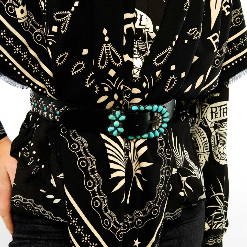 Notre ceinture LAZARO, confectionnée en cuir et déclinée en deux couleurs, s’accessoirise d’une boucle ornée de pierres turquoise, rappelant ainsi notre amour des codes esthétiques amérindiens.