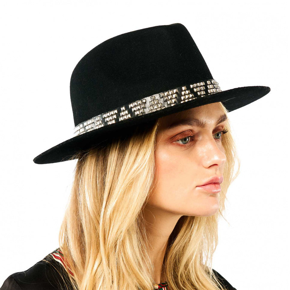 Le chapeau DALIA est noir, confectionné dans une douce feutrine, et décoré d’un lien en cuir dont les studs en chevrons rappellent ceux de la ceinture LARS, dans une inspiration western très tendance.