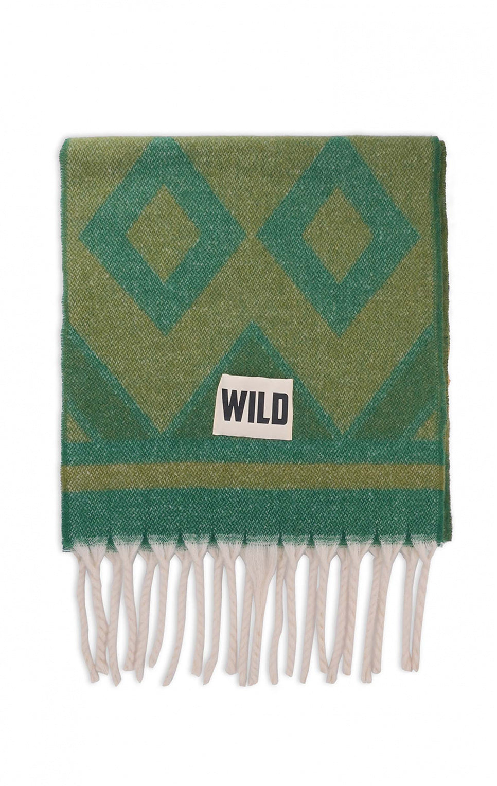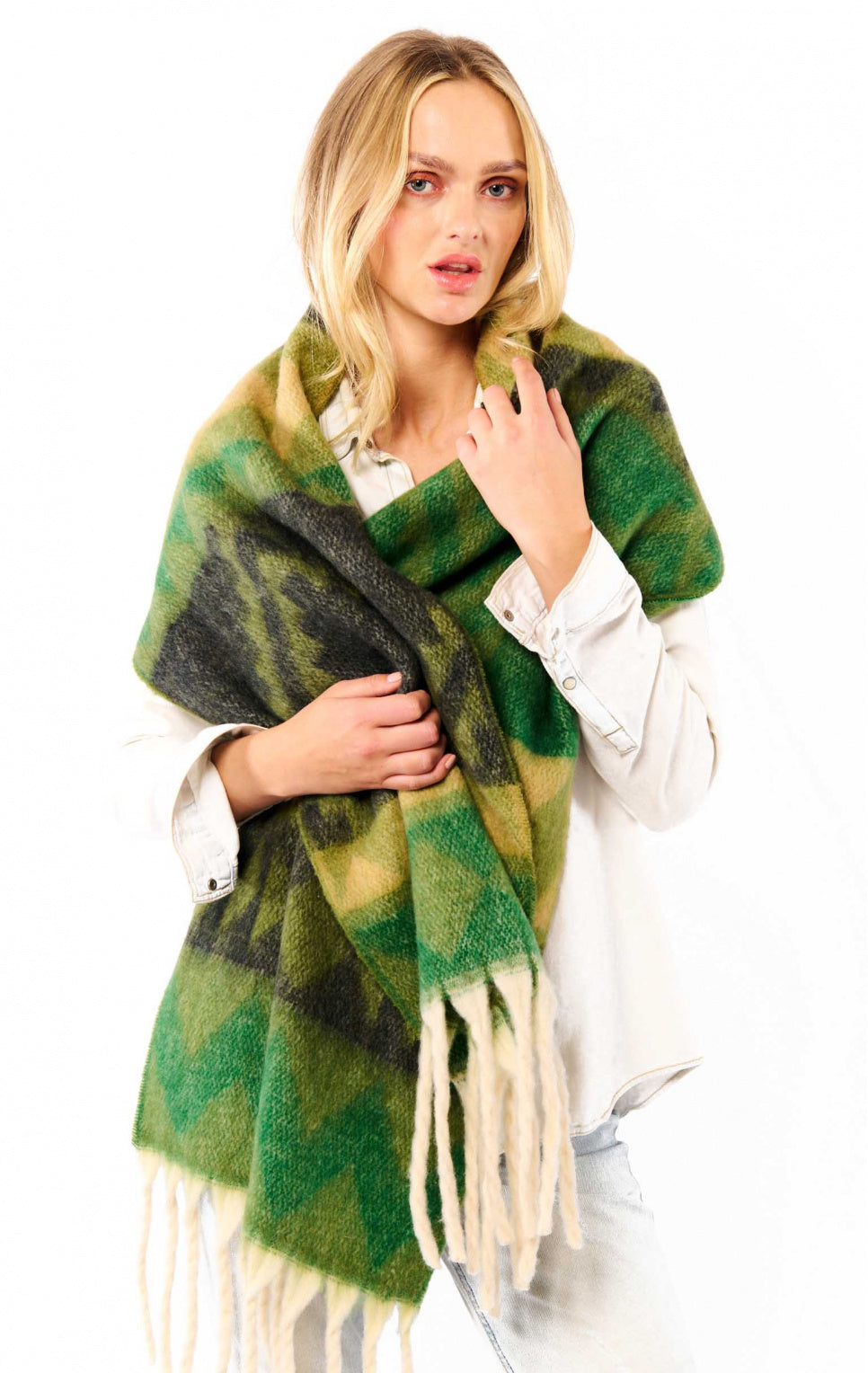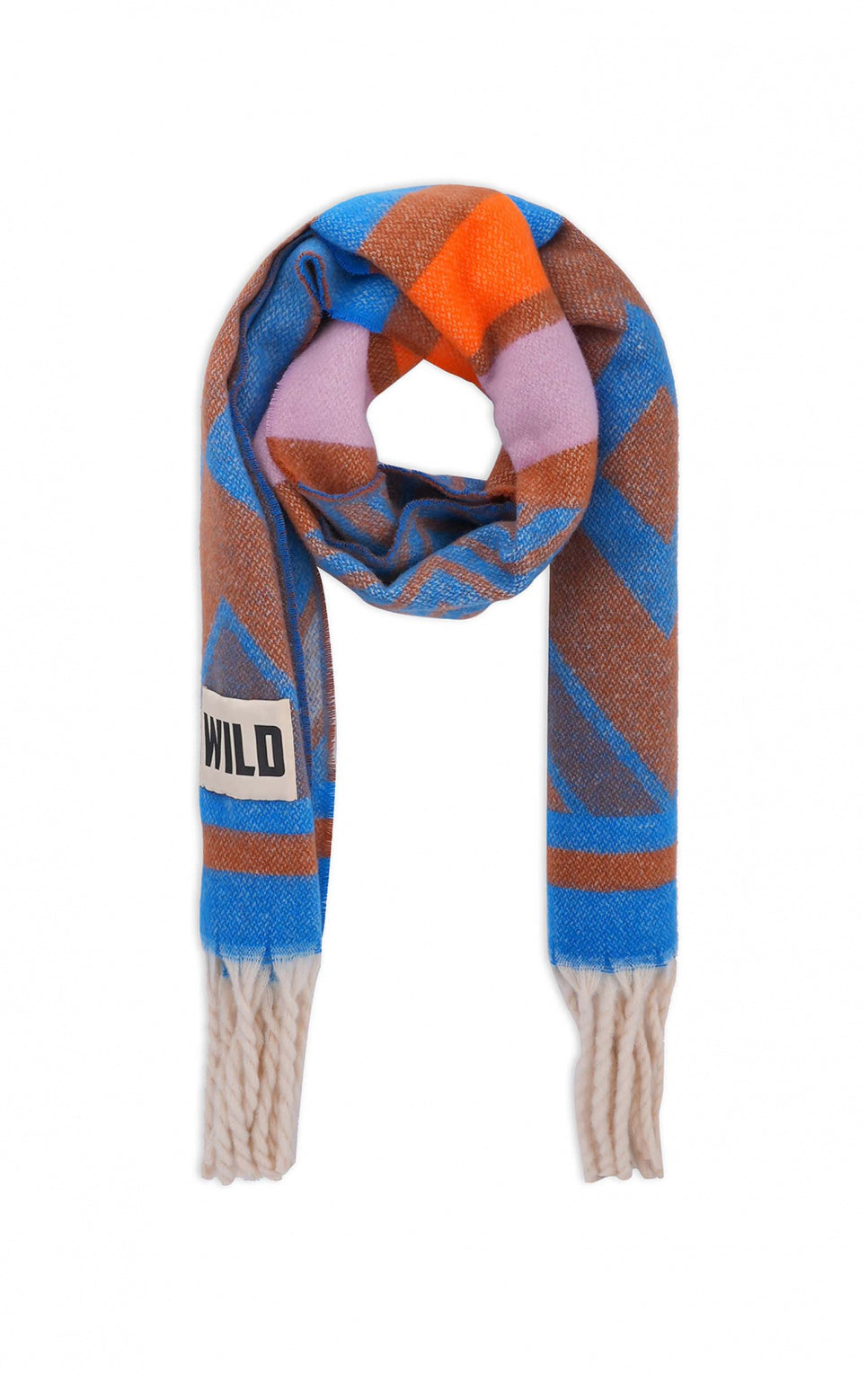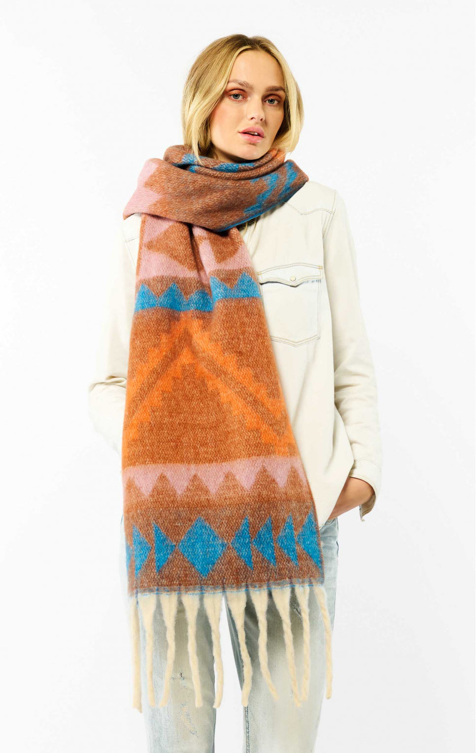 Large et très longue, elle se structure par des motifs à l’inspiration navajo dans des tons de turquoise, vieux rose, caramel et oranges pour la version bleue. Des franges beiges courent sur toute sa longueur, lui donnant ainsi une allure nonchalamment travaillée aux inspirations amérindiennes.