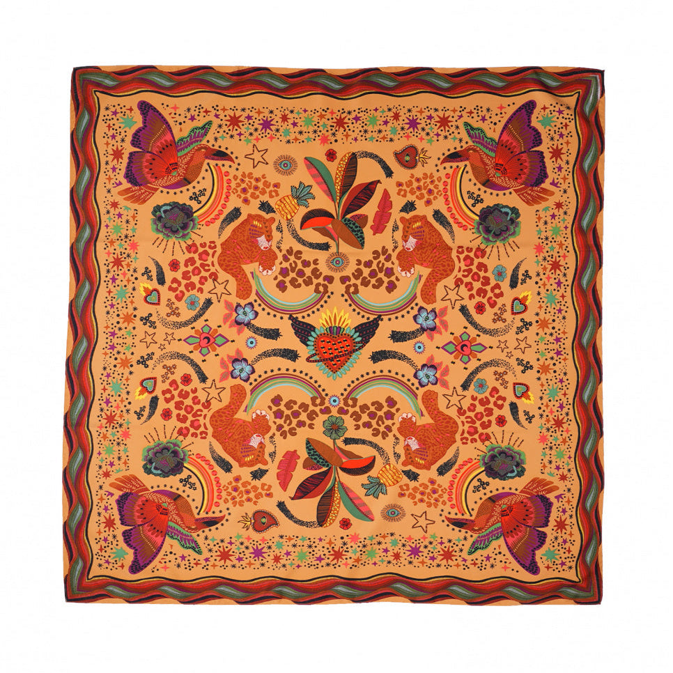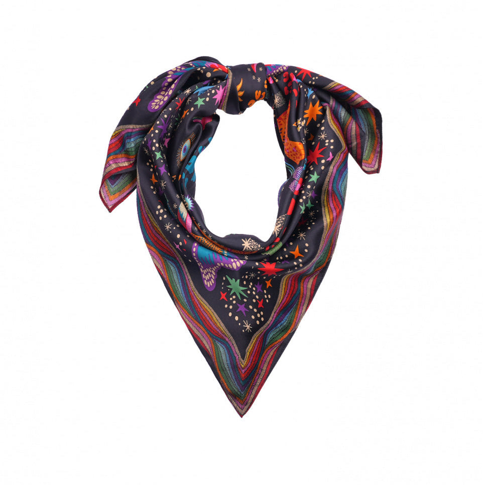 Nos foulards sont faits à la main et sont parés de dessins originaux destinés à sublimer votre garde-robe. Empreint d’une esthétique visuelle fantastique et d’un imaginaire bigarré, l’imprimé Crazy World évoque, avec panache, les rêves et les mondes mystiques et colorés.