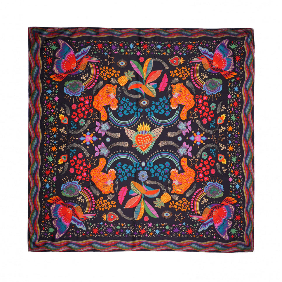 Orné d’incroyables animaux fantastiques, guépards tatoués ou phœnix à bec de toucan, qu’il mêle à des étoiles multicolores et des symboles oniriques, l’imprimé Crazy World nous plonge dans une esthétique narrative et mystique aux symboles joyeux et lumineux. Décliné en deux couleurs, il se pare, dans sa version noire, des nuances multicolores de l’arc en ciel, rose flamboyant, jaune, orange, turquoise, vert et violet. Versatile, il se porte aussi bien en foulard qu’en paréo selon le format. Nouez-le autour du cou, de la taille, en turban, ou même en accessoire chic sur votre sac.