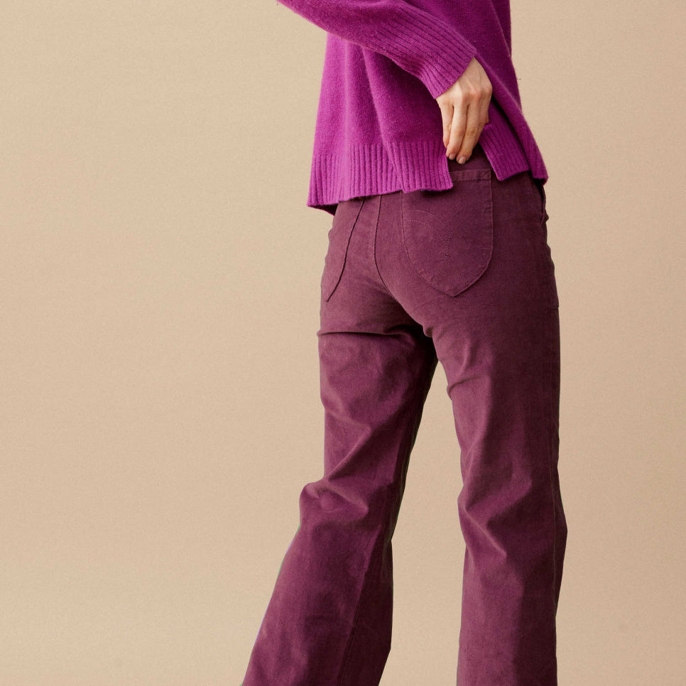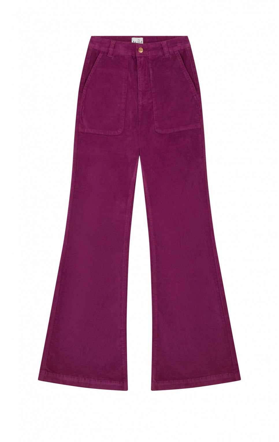 Pantalon en velours prune où bleu électrique, coupe retro seventies taille haute et évasée sur les bas de jambe.