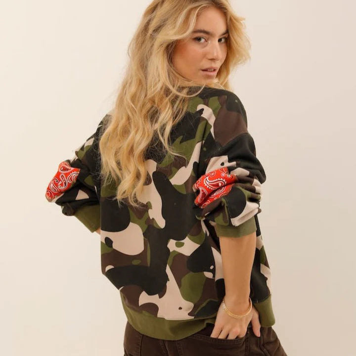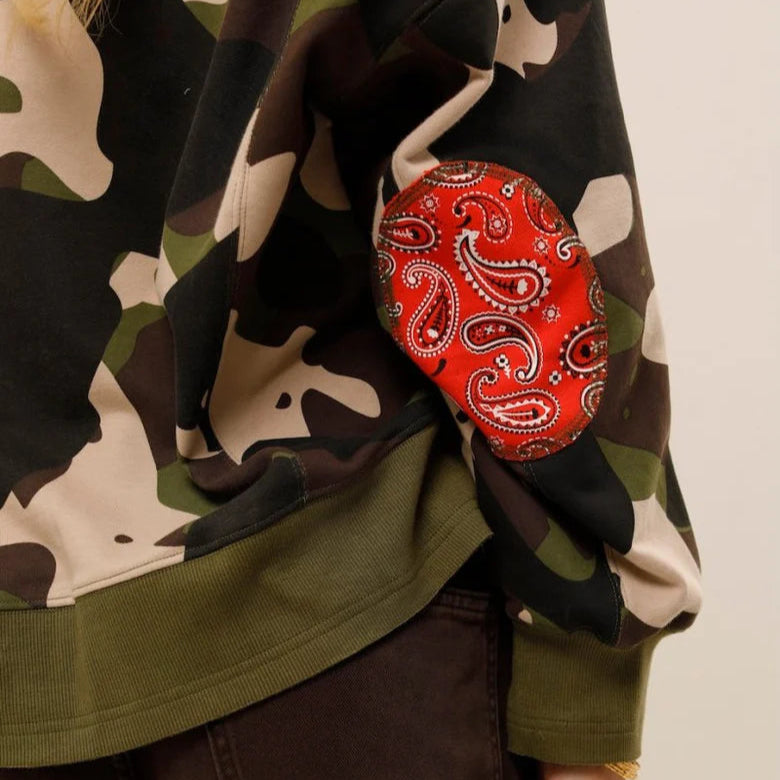 • Camouflage : molleton imprimé camouflage, coudières en bandana rouge brodé, bords-côtes kaki