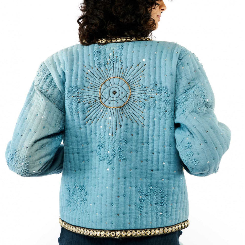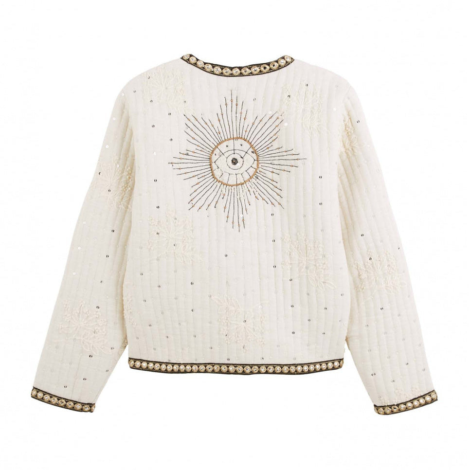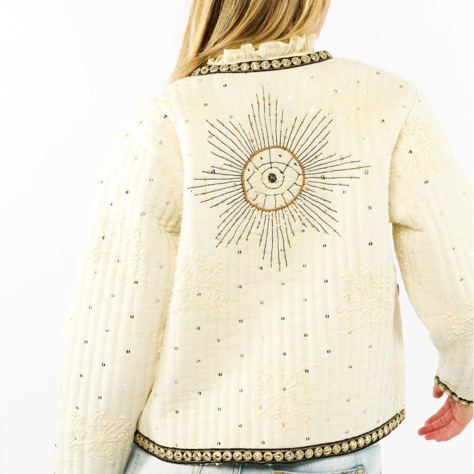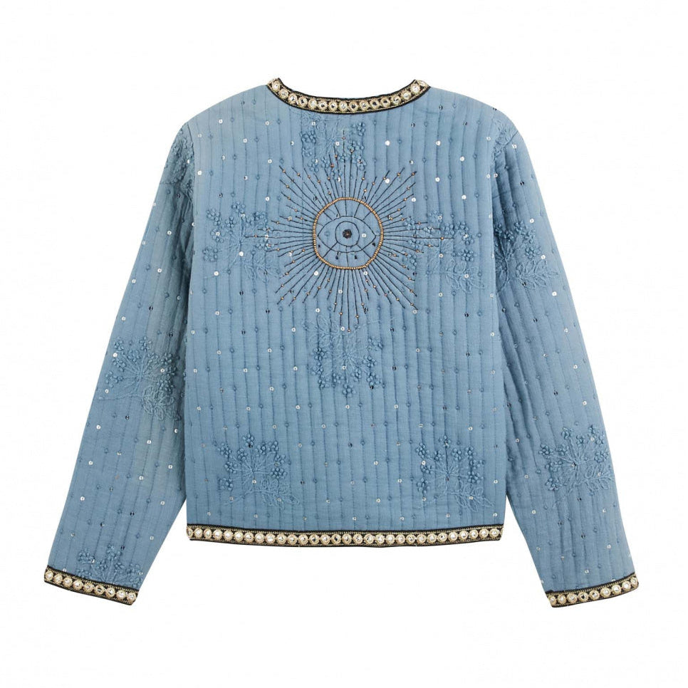 Structurée en gaze de coton rehaussée de sequins argentés, la veste VALENTIN se décline en deux couleurs, écru et bleu denim. Elle se porte courte pour une silhouette structurée. Un ruban gallon orné d’un précieux montage de fils lurex dorés et de sequins effet miroir se pose sur la patte de boutonnage, le col, le bas de vêtement et le bas de manche. Son col rond et ses petits boutons recouverts lui donnent une allure chic et très féminine. Et pour parfaire son caractère exceptionnel, elle se pare dans le dos d’une broderie de perles de rocaille dorées représentant un disque solaire à l’œil protecteur.