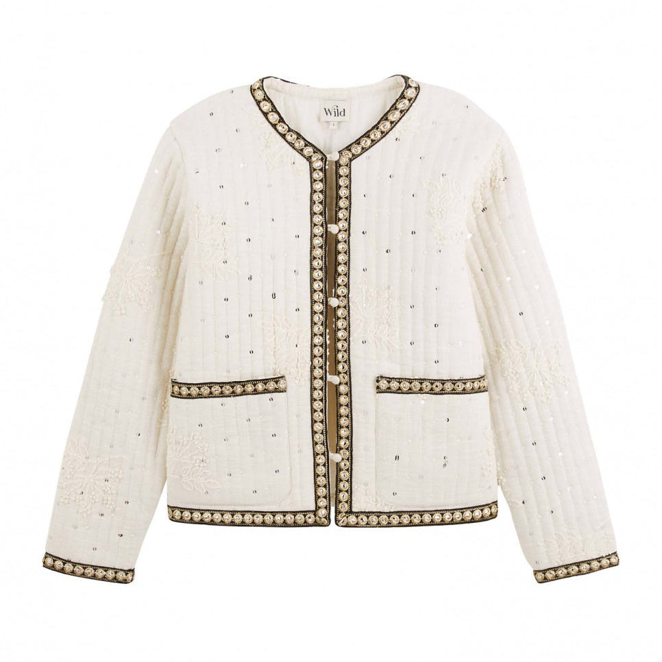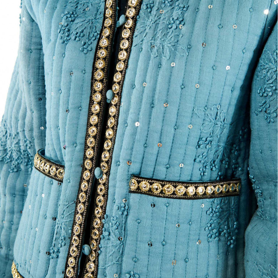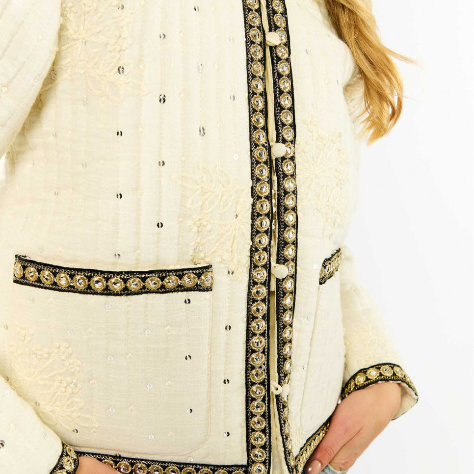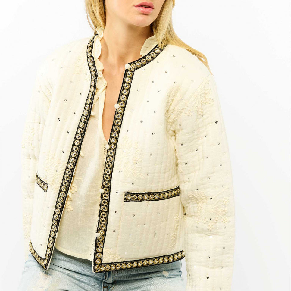 Structurée en gaze de coton rehaussée de sequins argentés, la veste VALENTIN se décline en deux couleurs, écru et bleu denim. Elle se porte courte pour une silhouette structurée. Un ruban gallon orné d’un précieux montage de fils lurex dorés et de sequins effet miroir se pose sur la patte de boutonnage, le col, le bas de vêtement et le bas de manche. Son col rond et ses petits boutons recouverts lui donnent une allure chic et très féminine. Et pour parfaire son caractère exceptionnel, elle se pare dans le dos d’une broderie de perles de rocaille dorées représentant un disque solaire à l’œil protecteur.